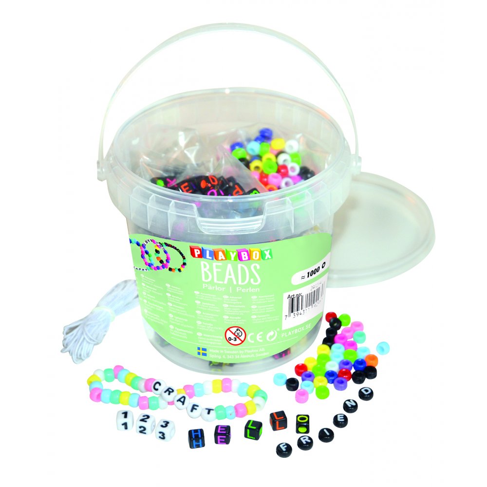 Bokstavspärlor och små kongopärlor i praktisk hink. Olika sorter av pärlor i massor av färger. Här ingår även elastisk snodd så det är enkelt att genast börja skapa egna armband och halsband, låt fantasin flöda. Den praktiska hinken förenklar förvaringen och minskar spillandet.