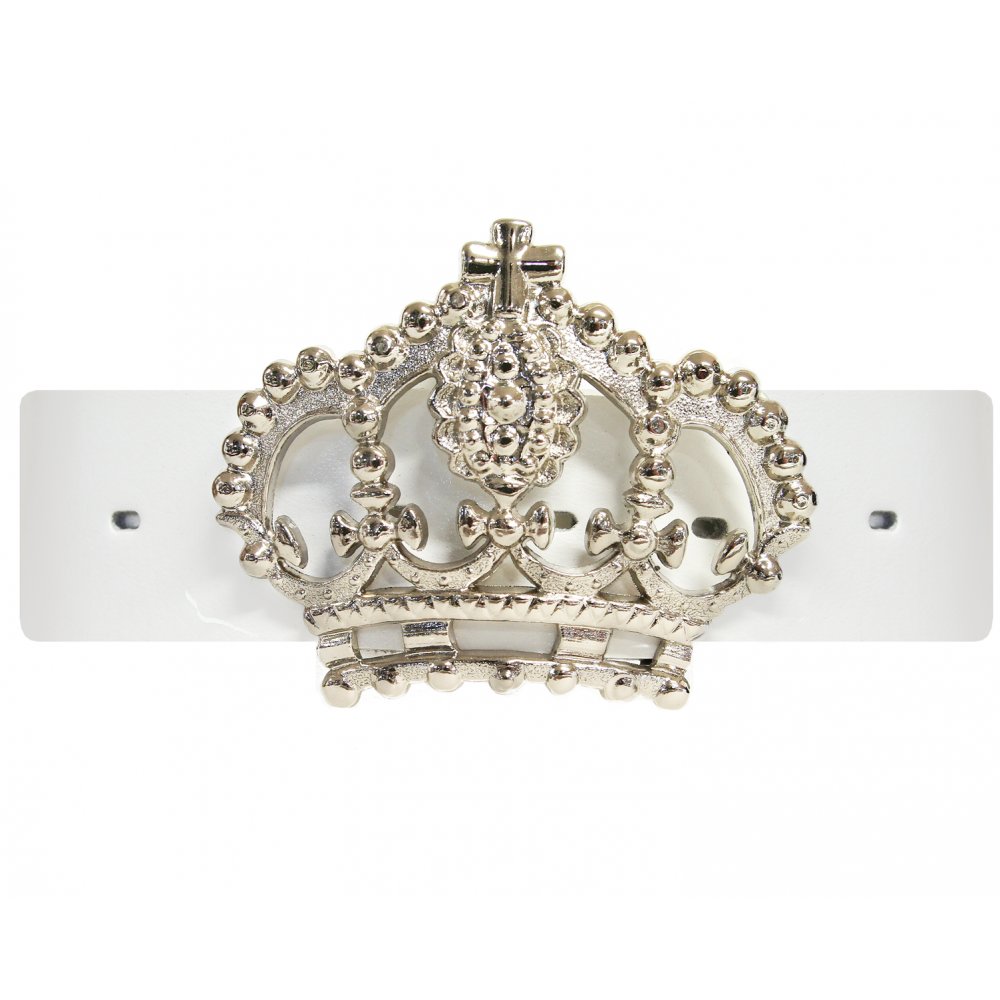 40 mm damskärp i kalvläder med stort spänne i kron-motiv och slät läderrem i lackerat kalvläder.