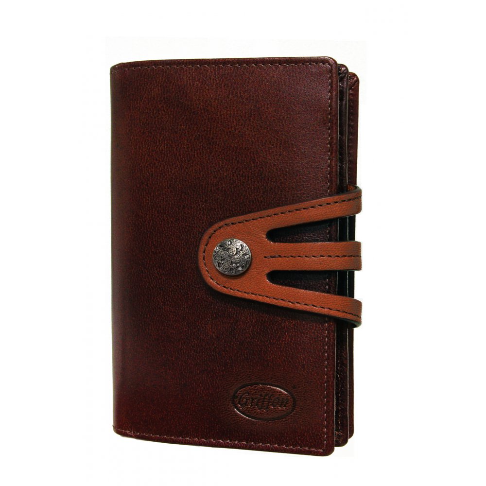 Plånbok i oxläder med konjaksbrunt spänne på framsidan. Insidan består av åtta kortplatser,
