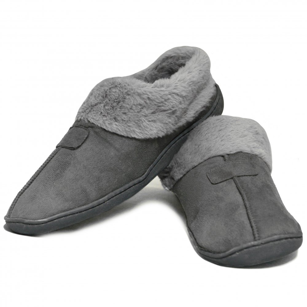 Innetofflor i mocka- och pälsimitation för dam med varmt innerfoder med bred pälskant.