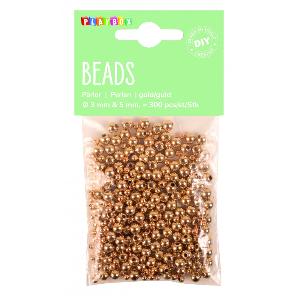 Guldfärgade pärlor i två storlekar. Passar fint i kombination med till exempel glaspärlor eller små kongopärlor.
