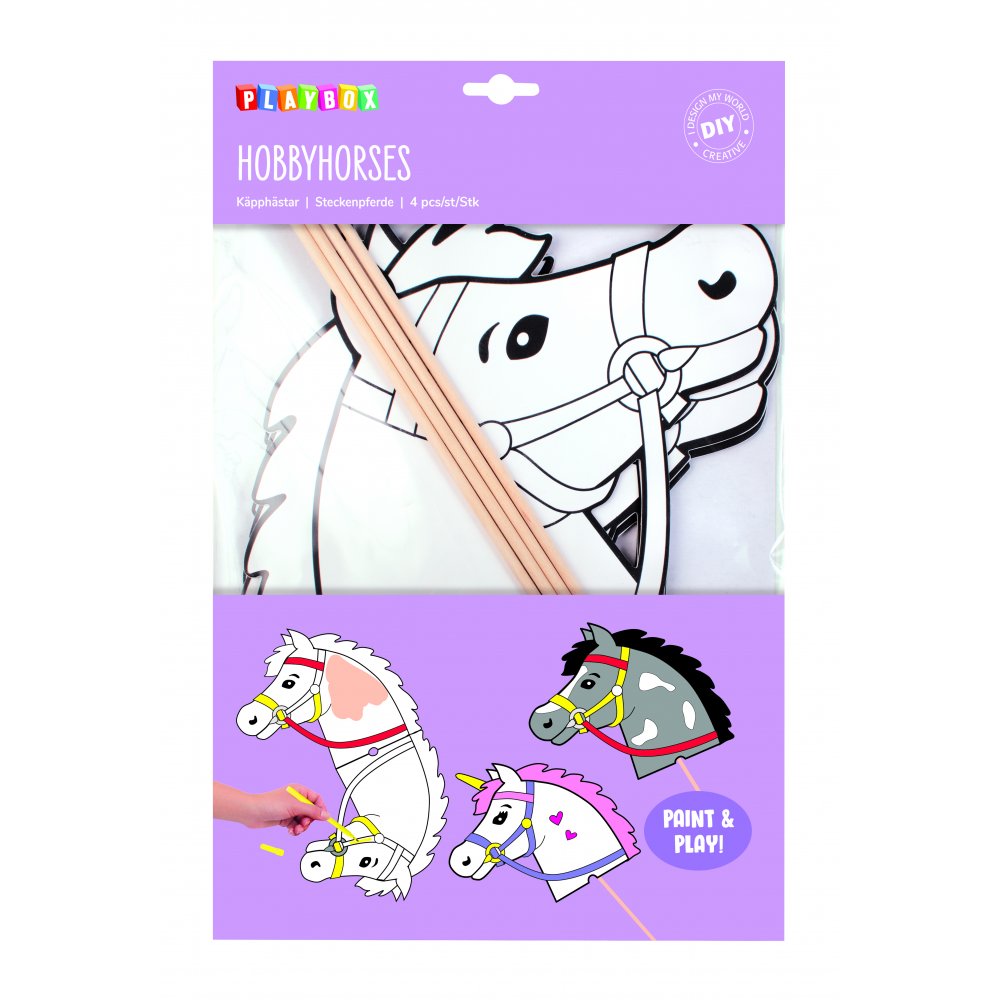 Dekorera din egen käpphäst eller enhörning. Färglägg och dekorera med glitter, kristallstenar eller washitejp. Fäst träpinnen och din häst är redo att börja tävla. Vem vinner galopptävlingen och dressyrtävlingen? I setet ingår material till fyra kompletta käpphästar.