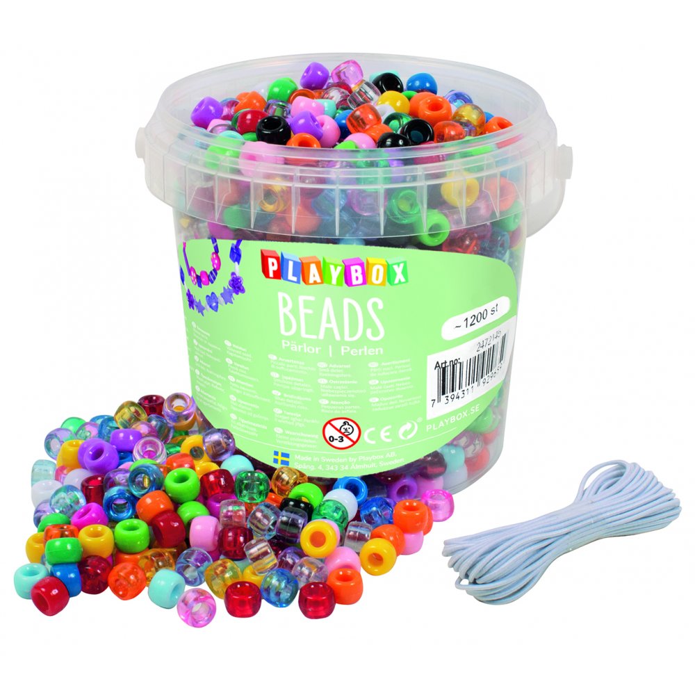 Färgsprakande kongopärlor i bas och transparent, med praktisk hink som förvaring. Den innehåller även elastisk snodd så det är bara att sätta igång att skapa direkt – armband, halsband eller andra dekorationer. En rolig sysselsättning att samlas kring eller varför inte ge bort i present.