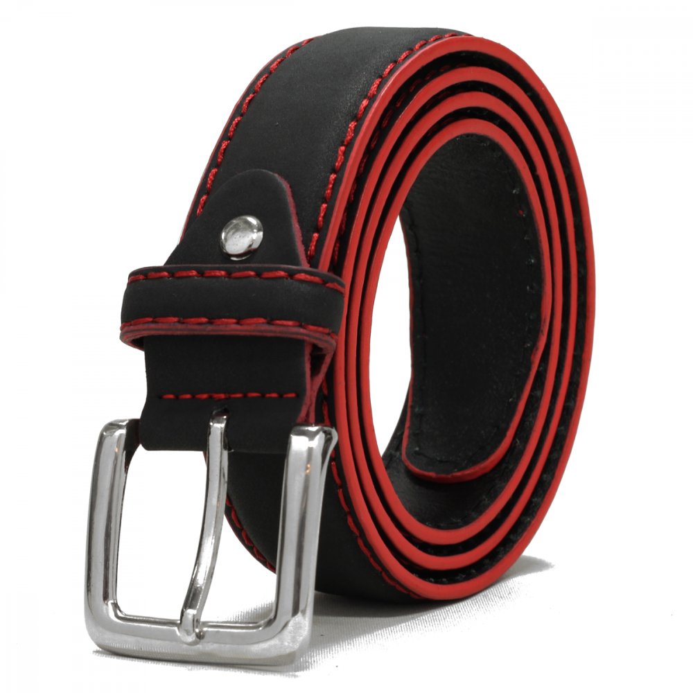 Stilfullt läderbälte med röda sömmar som tillför en subtil kontrast till det släta lädret och de kromade detaljerna.