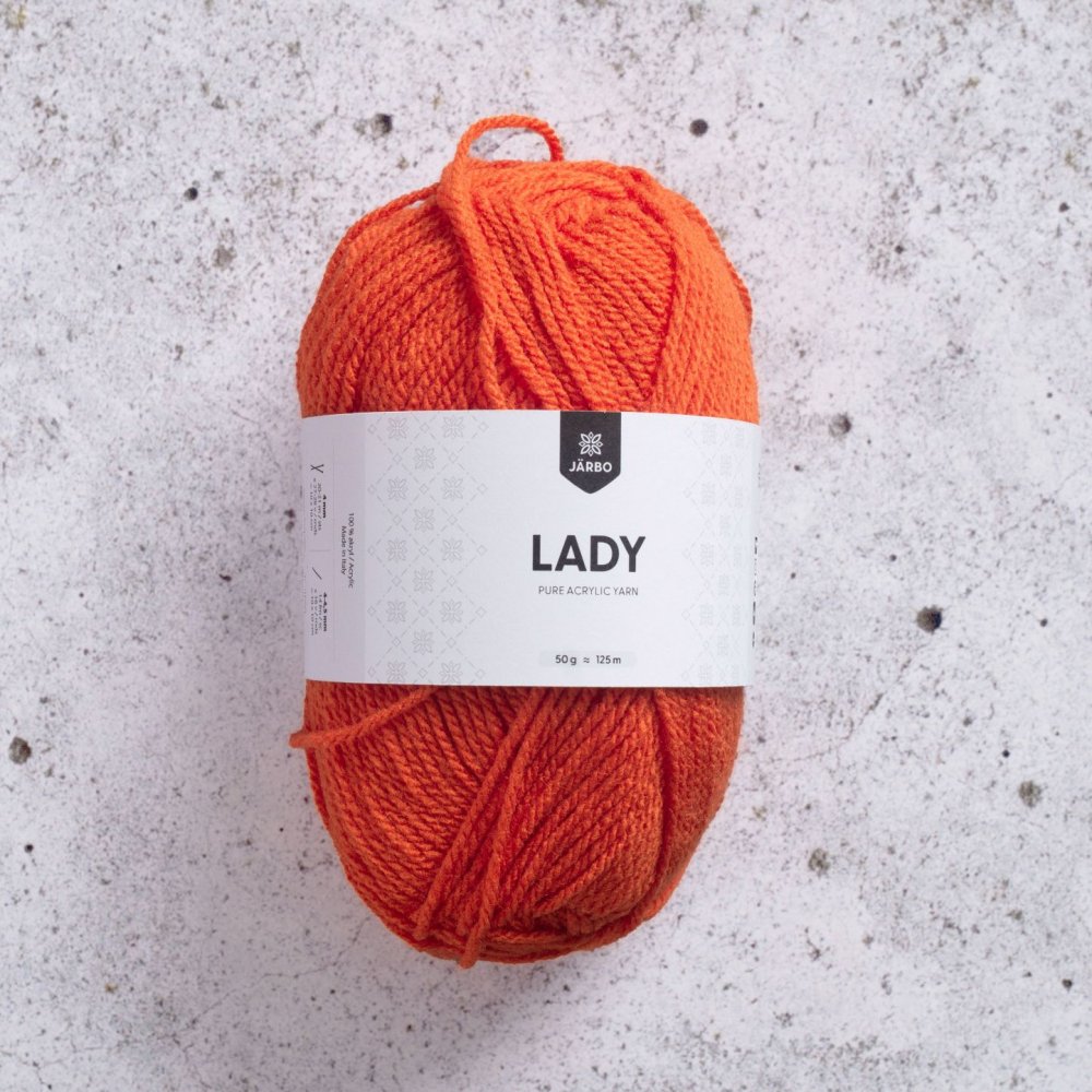 Lady 50g - Orange (59055)Trevligt akrylgarn som jag använt tillett par olika tröjor, håller bra i längden och är mjukt och skönt
