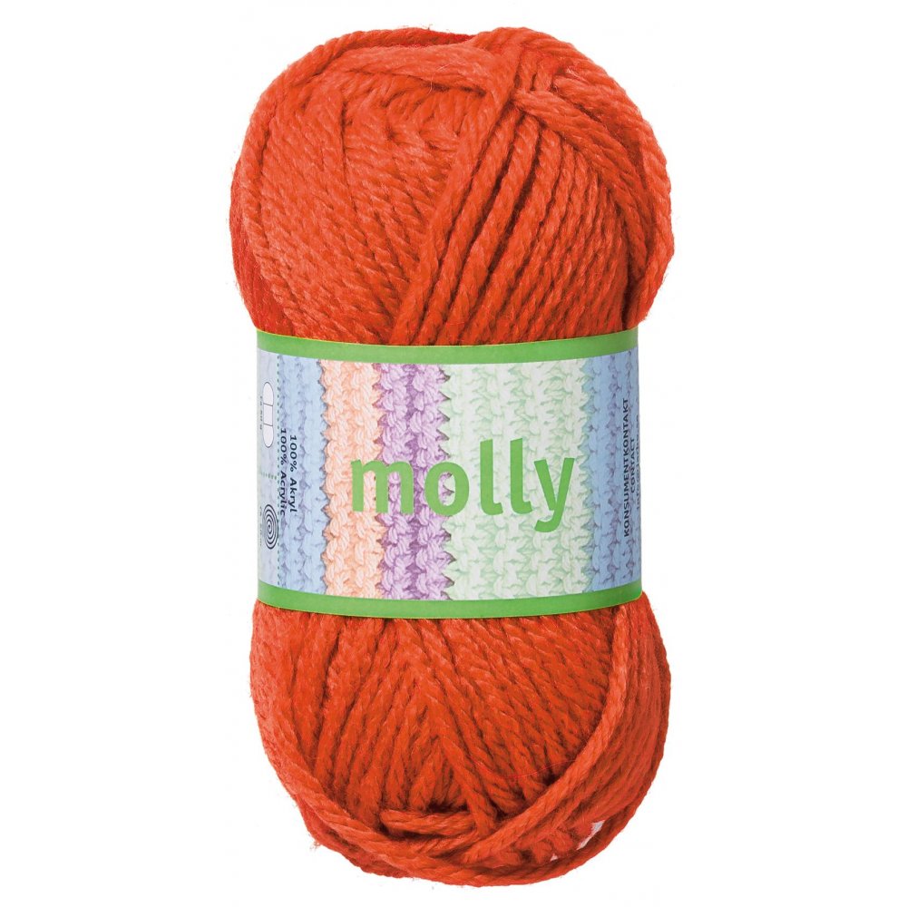 Molly är nog det skönaste mest användbara akrylgarn jag funnit till mössor, vantar mm. Tjockt, mjukt och lättstickat/virkat. Just denna röda har blivit flera par virkade bebisballerinaskor.