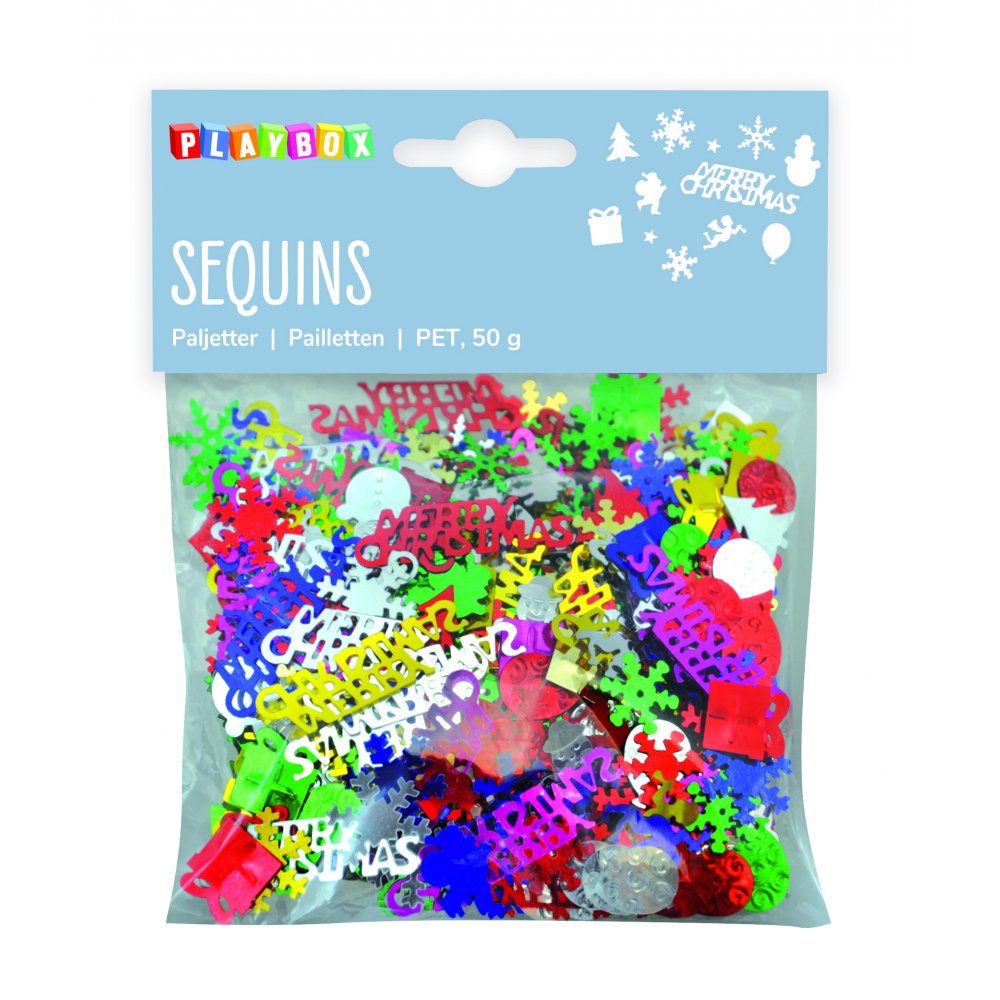 Paljetter med julmotiv i många olika färger. Klistra dem på ett papper och skapa egna julkort, inbjudningskort eller julhälsningar. Dekorera julklapparna eller placera på julbordet för en extra julig känsla.