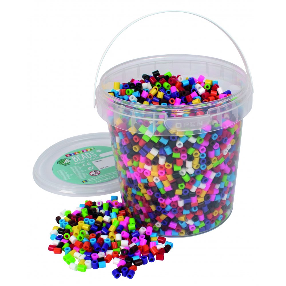 Hink med 5000 pärlor i blandade färger.