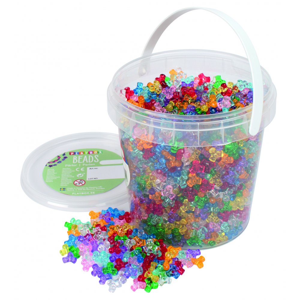 Pärlor i propellerform, färgglada och transparenta i många kulörer. Praktisk hink som förvaring. Skapa fantasifulla armband och halsband eller varför inte en personlig dekoration till nyckelringen.