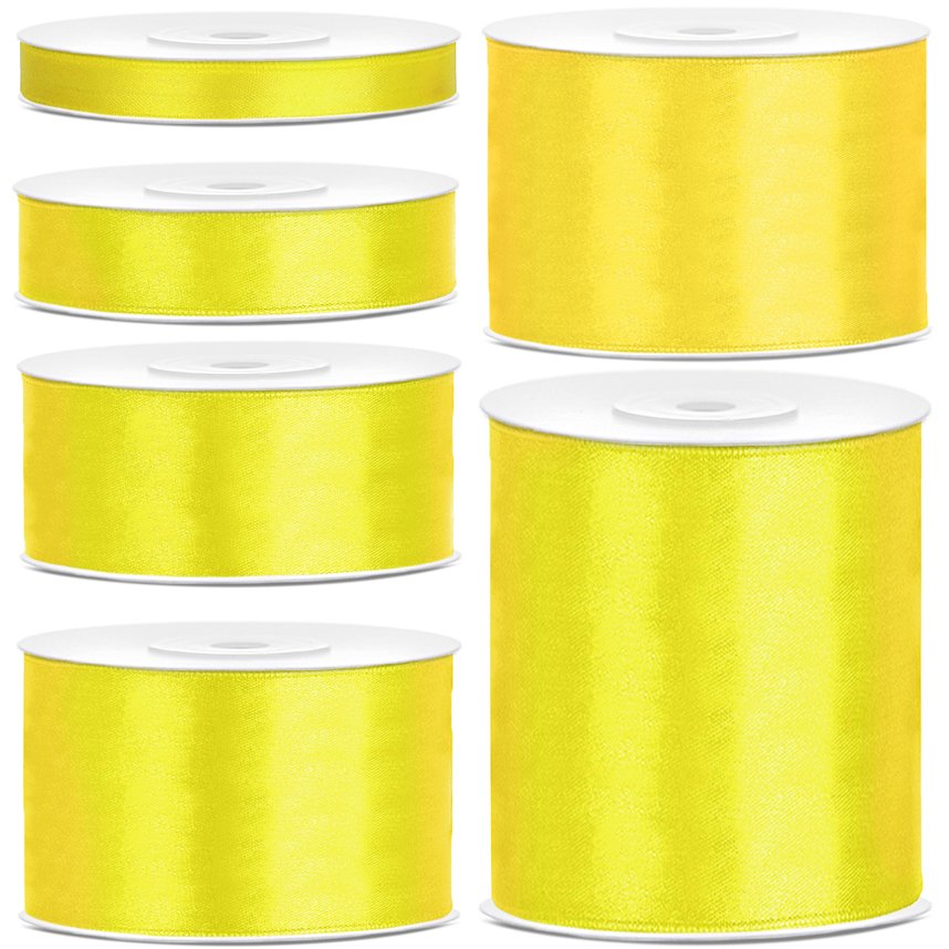 Satinband i gult i flera bredder. En rulle består av 25 meter band.
