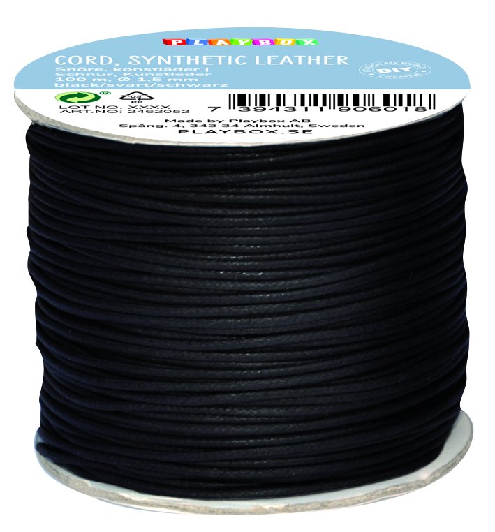 100 m snöre i svart konstläder, med en diameter om 1,5 mm.