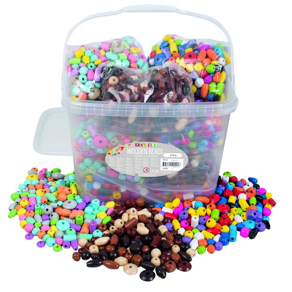 Back med 2.5 kg träpärlor i blandade former och färger.
