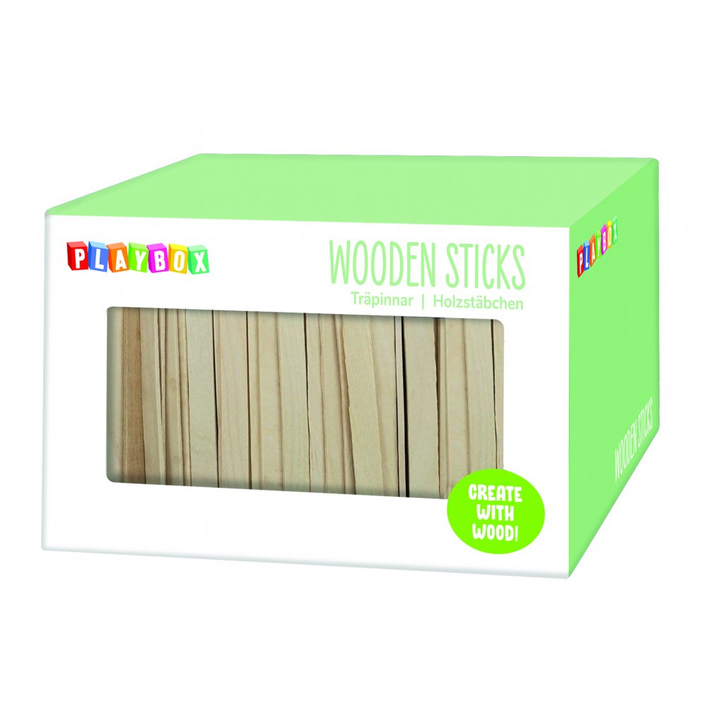 Naturfärgade träpinnar i box. Pinnarna kan målas och sammanfogas fritt efter egen fantasi. Ett kreativt pyssel som passar alla.