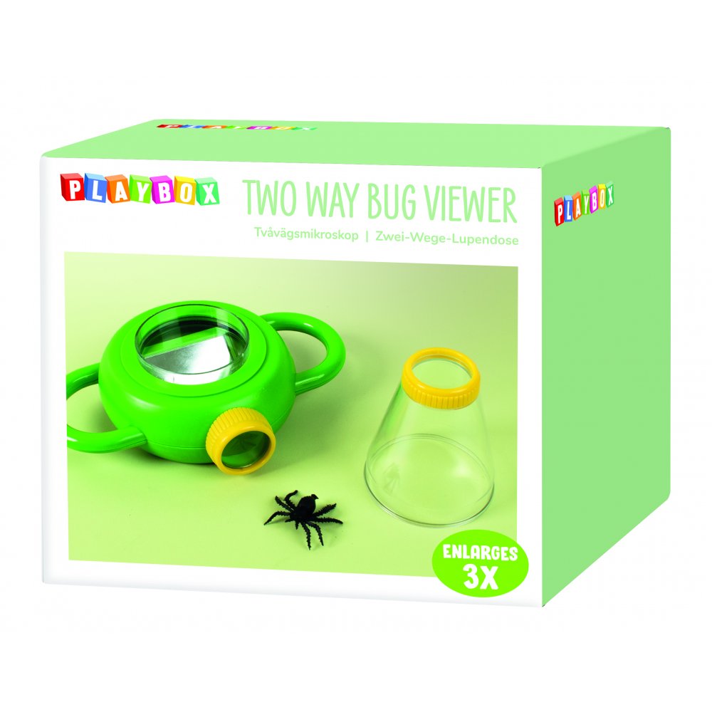 Tvåvägsmikroskop där du kan undersöka insekter eller andra saker du är nyfiken på från två håll. Konen är avtagbar och du lägger in det du vill undersöka i mikroskopet. Både förstoringsglaset i toppen och på sidan förstorar 3x. För att du direkt ska kunna börja undersöka följer en liten spindel i plast med burken.