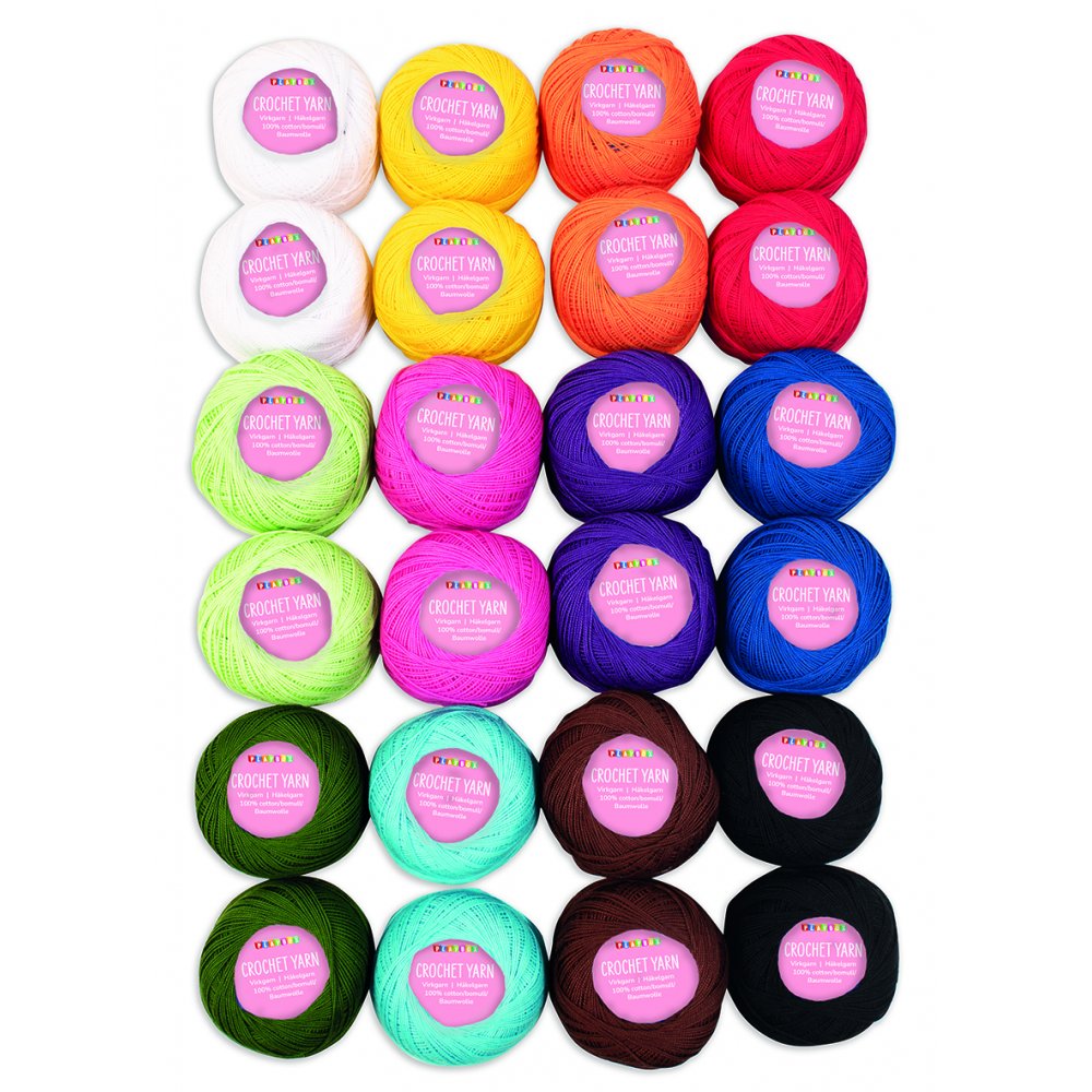 24 st nystan med virkgarn i tolv olika färger.